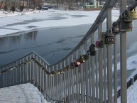 Пешеходный мост, по которому можно пройти на Монастырский остров, имеет два лестничных спуска на Набережную. Влюблённые пары подвесили на ограды этих спусков гирлянды замочков любви.